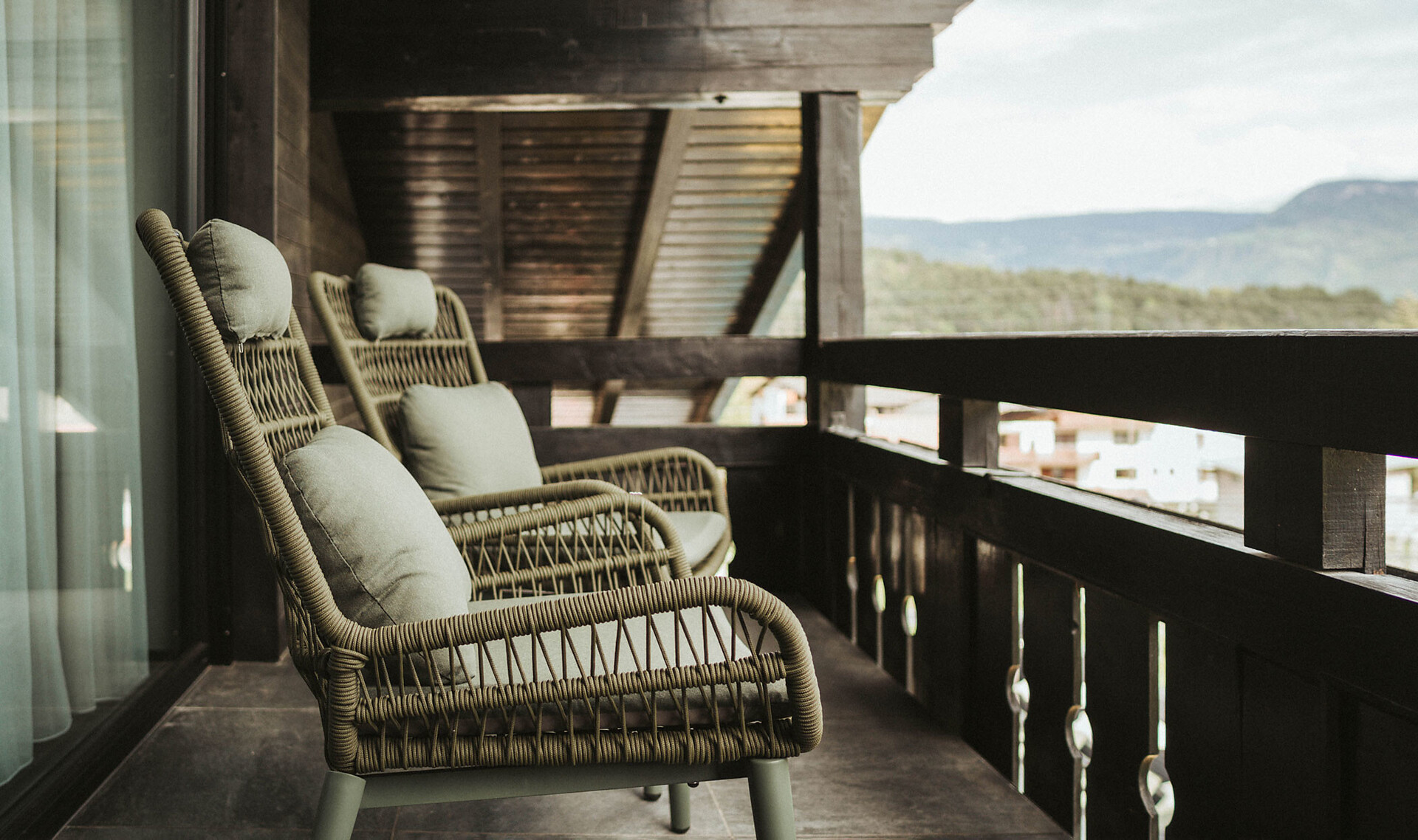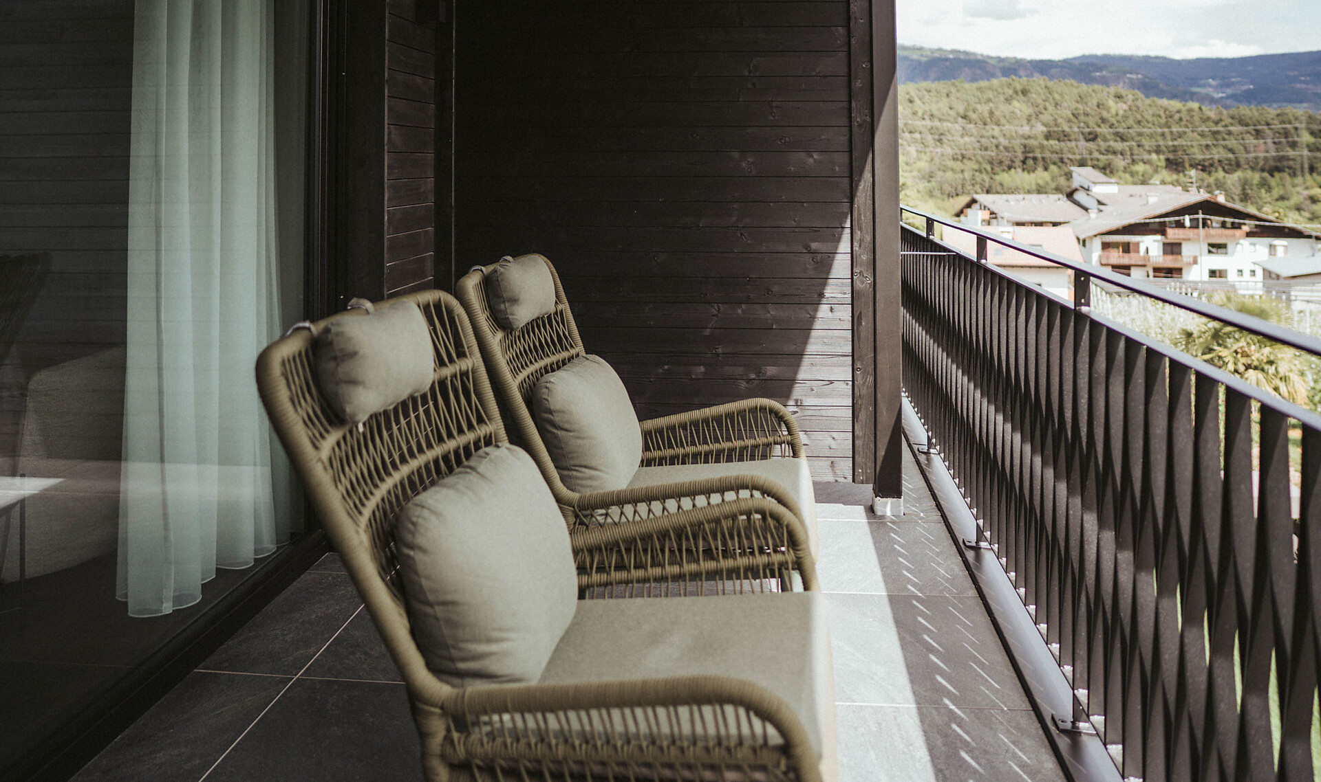 • Terrazza panoramica esposta a sud con aree salotto e lettini e una vista mozzafiato sulle Dolomiti