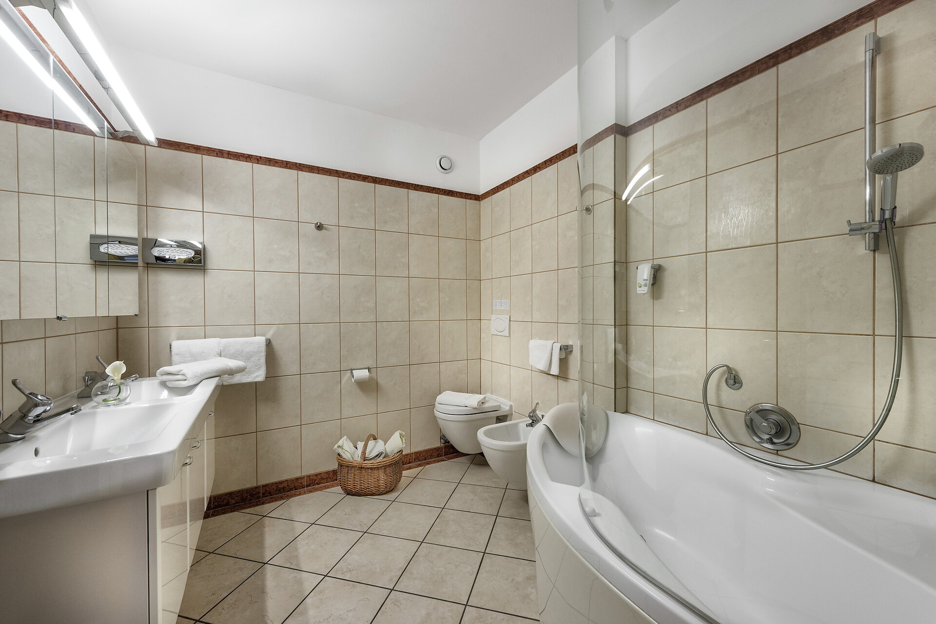 • Cestino spa con asciugamani e accappatoi (Nel rispetto della sostenibilità, vi chiediamo di portare le vostre ciabatte da bagno. Su richiesta, le pantofole dell’hotel sono naturalmente disponibili alla reception.)