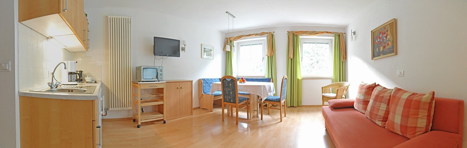 Letto matrimoniale, Divano letto matrimoniale, Terrazza, Giardino, Senza barriere architettoniche , Biancheria da letto disponibile, Cassaforte, Appartamento non fumatori, Situato al piano terra, Cucina abitabile, Macchina da caffè, Lavastoviglie, Piano cottura elettrico, Stoviglie, Scaldaacqua, Forno, Doccia / bagno, Bidet, Fon, Asciugamani, Vasca da bagno, Lavatrice in appartamento, TV, TV satellitare/via cavo, WLAN, Vista panoramica, Lato sud